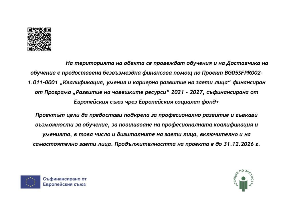 -BG05SFPR002-1.006 “Започвам работа” – Компонент 2 “Обучение”, финансиран от П “Развитие на човешките ресурси” (2021-2027), съфинансирана от Европейския съюз чрез Европейския социален фонд+. Проектът предоставя възможност на неактивни и безработни лица да се включат в обучения за придобиване на степен на професионална квалификация или част от професия, както и за придобиване на умения в рамките на ключови компетентности 1, 2, 3, 5, 6 и 7.