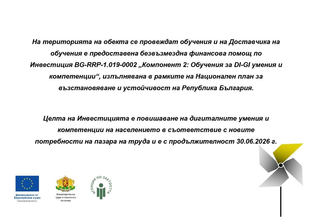 -П3 “Предоставяне на обучения за дигитални умения и създаване на платформа за обучение на възрастни”, финансиран чрез Националния план за възстановяване и устойчивост. Проектът предоставя възможност за включване на безработни и заети лица в обучения за придобиване или повишаване на цифрова компетентност за Базово ниво (ниво 1 и 2 съгласно DigComp) и Средно ниво (ниво 3-4 съгласно DigComp) съгласно Европейската рамка за дигитални компетенции DigComp 2.1.